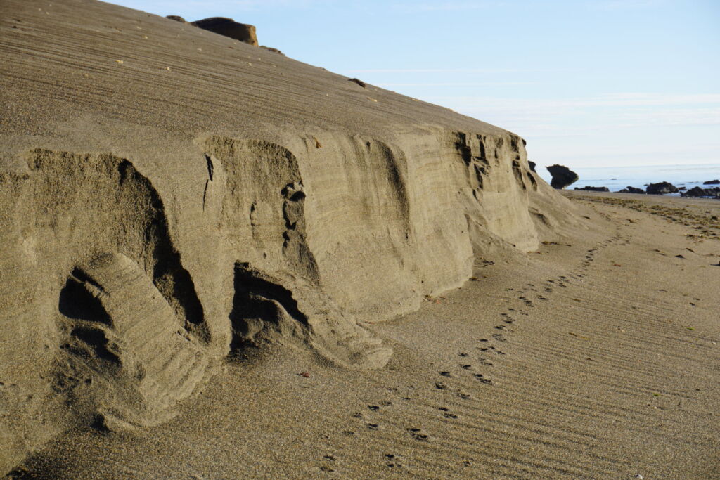 Cabo Peñas is a geographical feature located 15 km southeast of the city of Río Grande, standing 30 metres high. The Selknam called this cape “Amiskn,” meaning “the fallen blocks at the foot of the cape,” and the Haush called it “Oijei,” meaning “fishing place.” Its name was assigned by the brothers Bartolomé and Gonzalo Nodal on January 20th, 1620. They were explorer navigators and named it in reference to Cape Peñas located in Asturias, Spain, where they were from. The rocks we can observe are fragments from the same cape, sedimented and eroded, measuring between 5 and 10 metres, and shaped by the action of the wind and the sea. Near the cape on the cliffs, there is a lighthouse, which has been in operation since 1916. It is 13 metres high, and access is free via stairs.